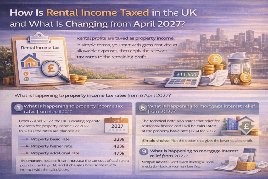 Rental profits are taxed as property income. In simple terms, you start with gross rent, deduct allowable expenses, then apply the relevant tax rates to the remaining profit.